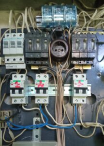 Gyvenamojo namo Taikos pr. 42, 1 laiptinėje, seni paketiniai jungikliai pakeisti dvipoliais automatiniais jungikliais.
